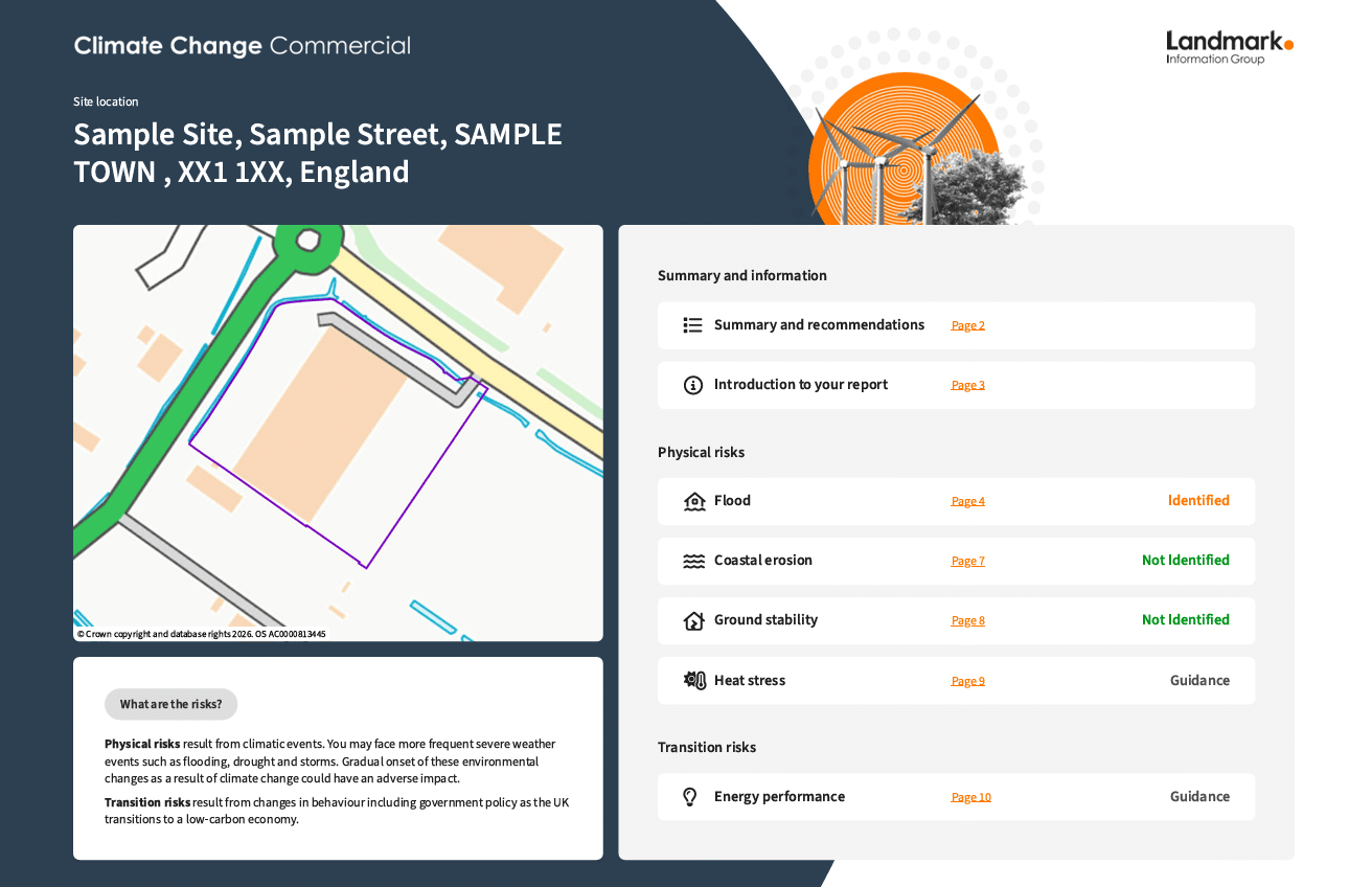 Covers: Flood Risk, Subsidence, Heat Stress, Coastal Erosion, EPCs
