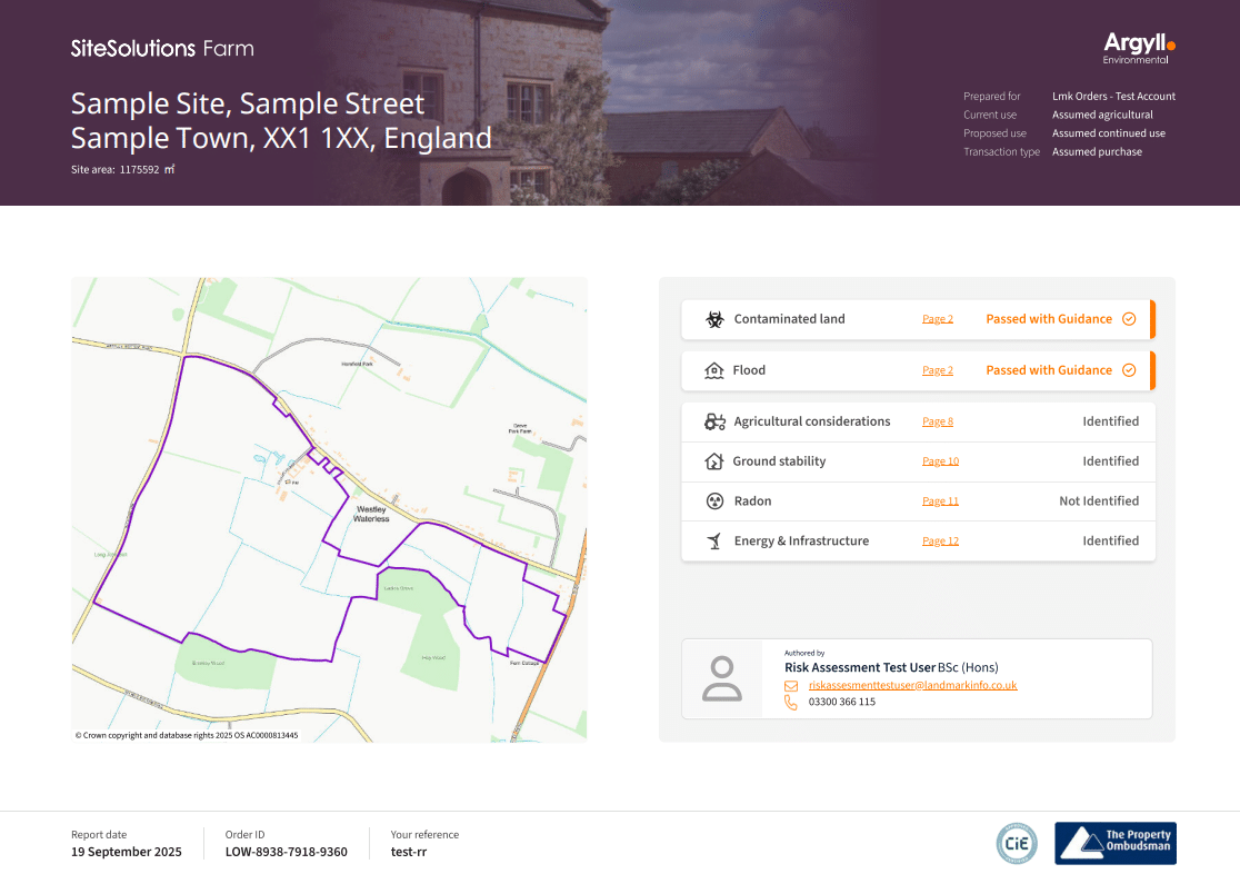 Specialist report for contaminated land risk for farms and farmland. Includes extensive advice and the most comprehensive range of data relevant to farming and includes a flood risk assessment. Designed for farmland transactions, renewable energy projects, infrastructure and other large area transactions.